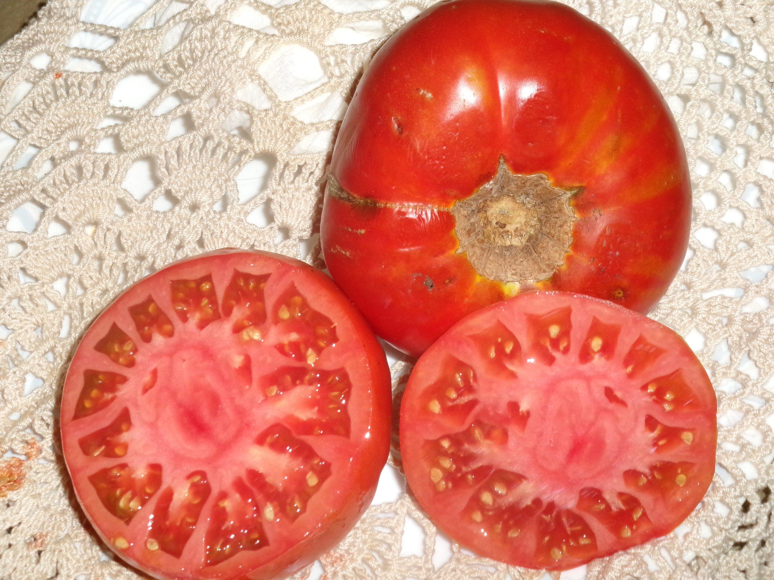 This tomato is a show stopper. Fruits are around 12 ounces to over a pound of perfect blunt shaped red fruits. Flavor is super sweet, few seeds. Very productive plant. Indeter, mid season One of my favorites this year
