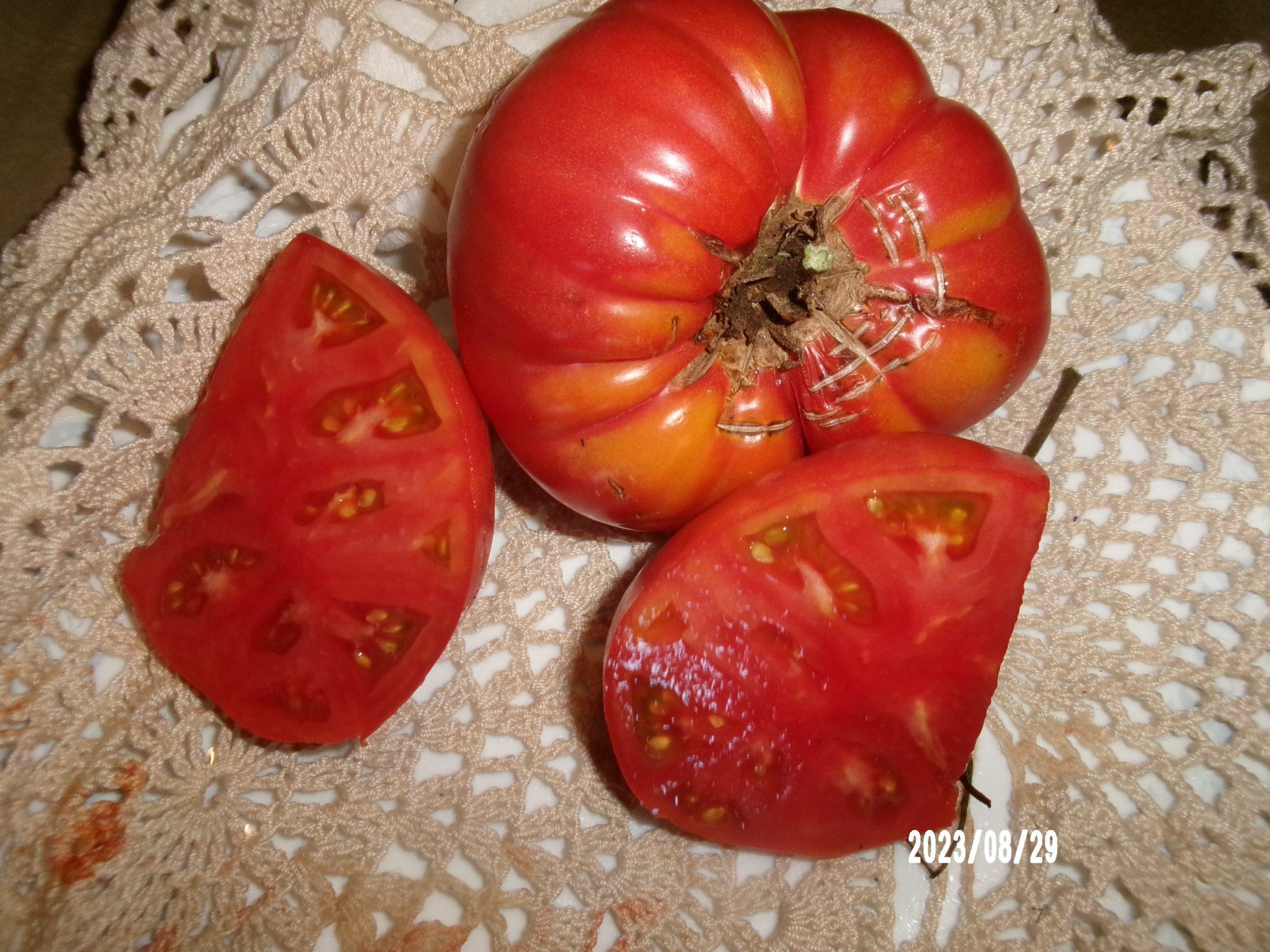 Large pink Meaty blunt heart shaped tomato, sweet with a slight acid finish, fruits are 12 ounces to a pound. Beautiful fruit. Indeterminate plant Later producer.