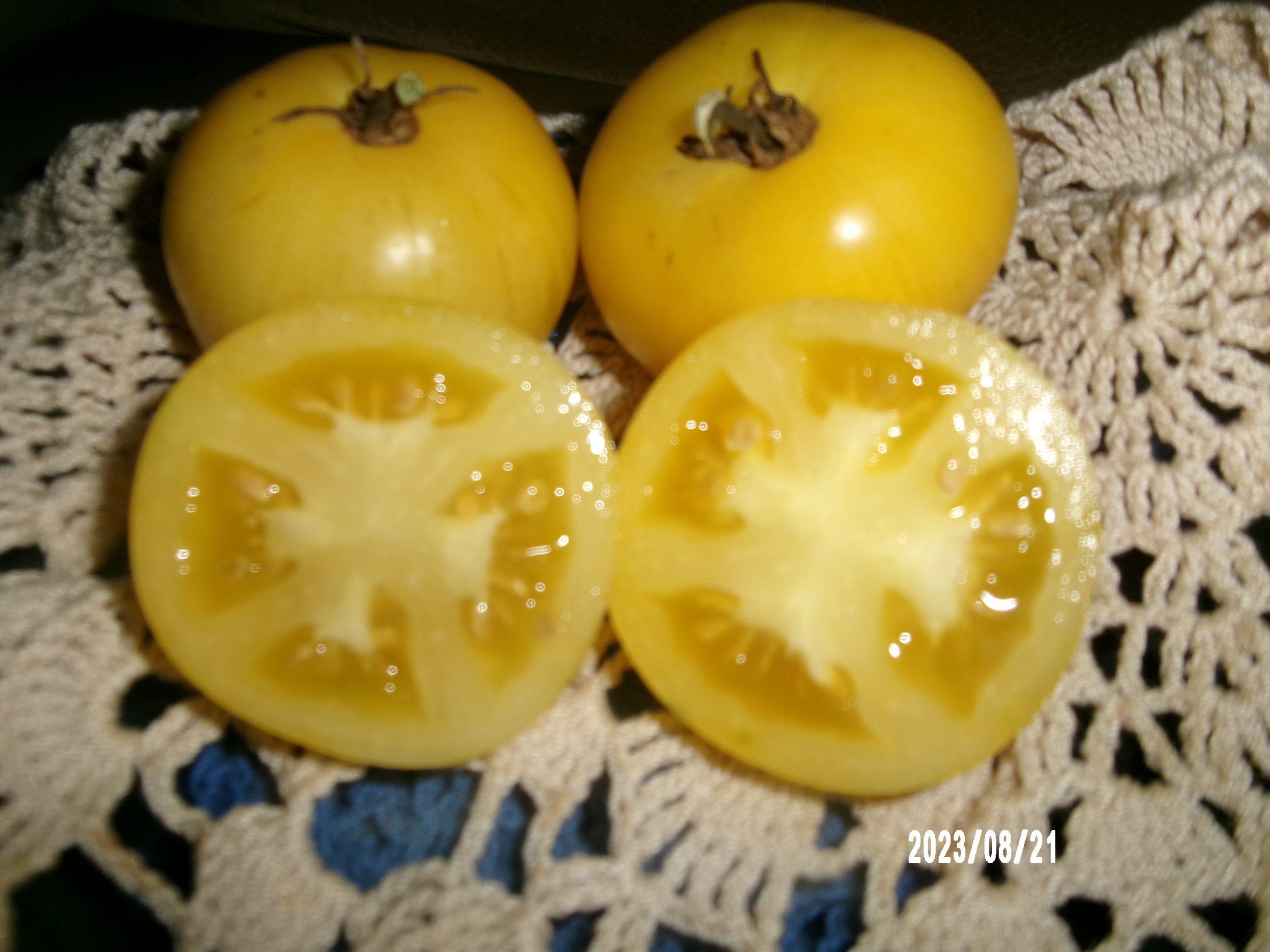This is a yellow white colored saladette tomato with faint whit stripes. This tomato has deep thick walls with about 4 seed locules full of seeds. The flavor is very tangy, with a slight sweet finish. Great tomato if you let it come to full ripeness it gets sweeter. Plants are very prolific. Tomatoes are 4-6 ounces. Indeter