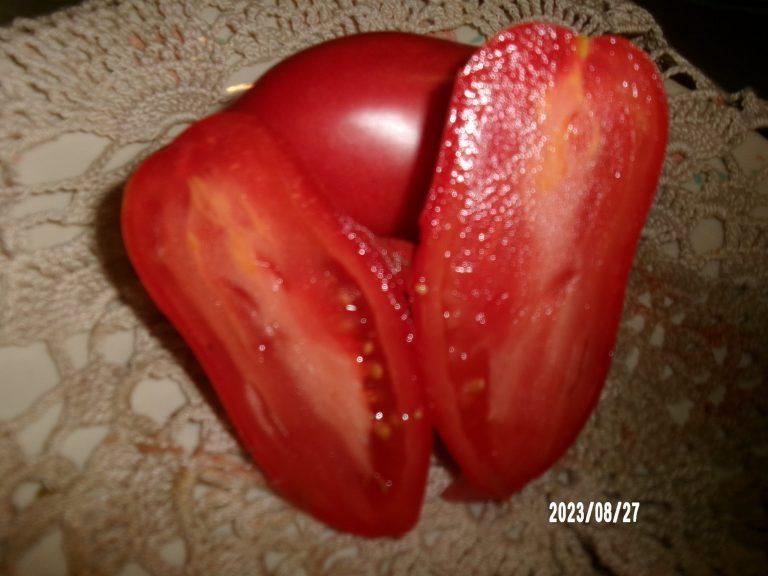 This is a sauce type with meaty juicy sweet flavor, great for cooking or in a salad or for salsa. Very sweet flavor unlike most paste types, very juicy. Prolific production. Fruits were up to about 12 ounces